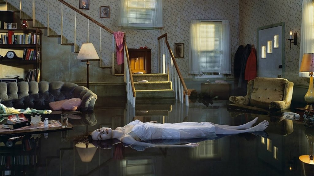 La obra de Gregory Crewdson ocupa un lugar singular dentro de la fotografía contemporánea. Aunque utiliza la cámara fotográfica, su método de trabajo y su lenguaje visual se acercan más al cine y al teatro. Uno de los rasgos más evidentes de su trabajo es la escenificación total de la imagen. Crewdson no busca capturar un instante espontáneo; en cambio, construye cuidadosamente cada escena. Las calles, las casas, los personajes y la iluminación se organizan como si fueran elementos de una película detenida en un solo fotograma.